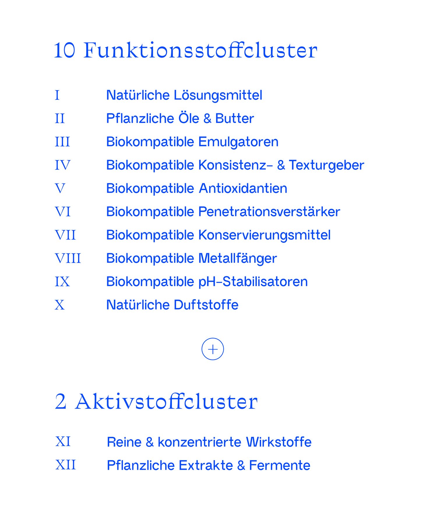 Zusammengefasst sind unsere Inhaltsstoffe in 10 Funktionsstoff- und 2 Aktivstoffcluster. Sie bilden die Basis aller unserer Formulierungen sowie unseres Markennamens TEN TWELVE.