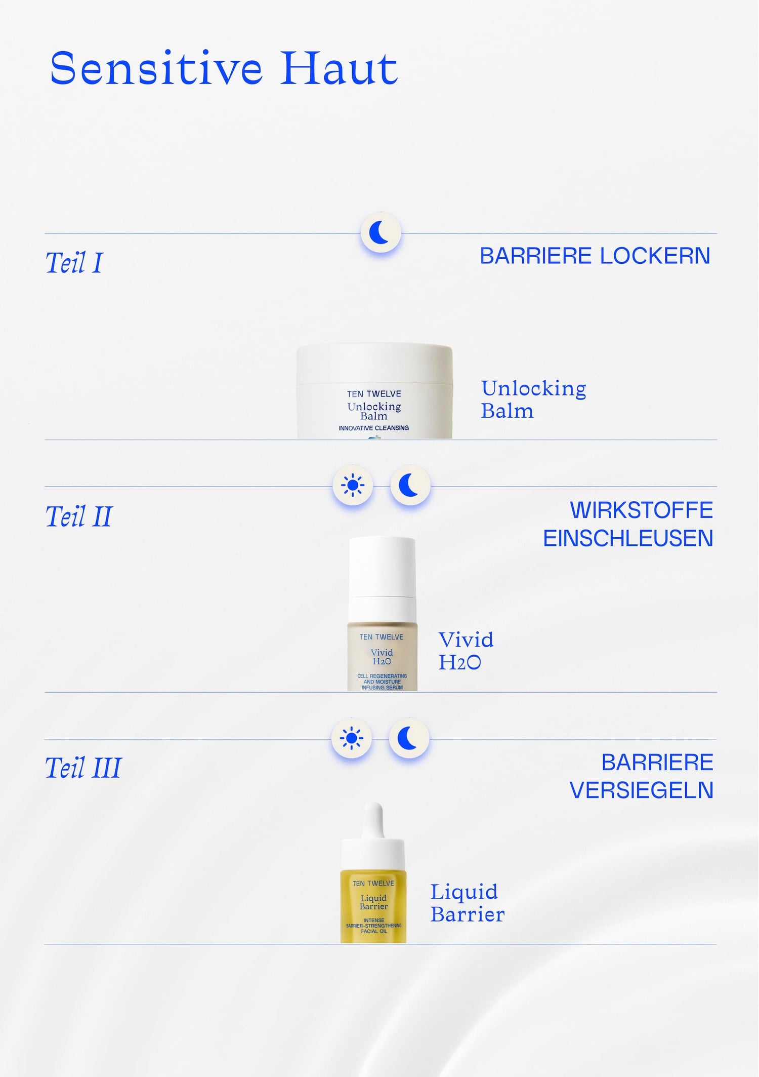 Die TEN TWELVE-Strategie: Keep it simple. Wir stärken die Hautbarriere, blockieren Entzündungsprozesse (Liquid Barrier) und optimieren gezielt den Feuchtigkeitsspeicher (Vivid H2O).